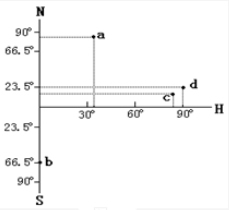 5、单选题 下图中,横坐标为某日的正午太阳高度,纵坐标为纬度,读图回答下题