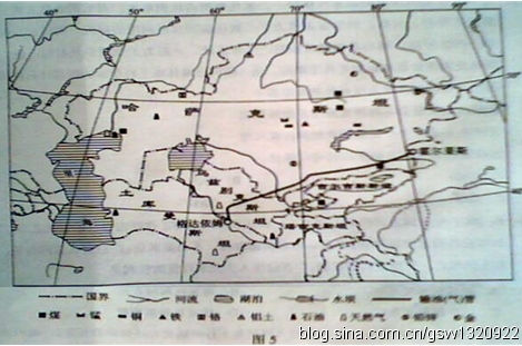 4、综合题 分析图文资料,完成下列各题。 中亚地区与我国西部有长达3300千米的边界线,是当今世界石油、天然气等资源储量丰富的地区之一。苏联的解体和中亚五国的独立,凸显了中亚地区在国际战略格局中的地位。 材料一 1941年苏联卫国战争爆发后,苏联国防委员会决定,把莫斯科、列宁格勒以及国家中心地区其他工业城市的特大工厂的设备、物资和人力资源全部或部分迁移到大后方,即乌拉尔、西伯利亚和中亚地区。截止1941年底,被迁走并迅速投产的工业企业已达1523家,其中有1360家属于国防工业部门。随后成立了国家疏散工作委员会。制定企业疏散问题的法令。苏联国防委员会和国家疏散工作委员会统筹领导疏散工作。 1942年前8个月的统计表明,上述地区的工业产品总值已经达到344亿卢布,而1940年全年只有480亿卢布。1942年12月苏联国家计划委员会指出,在国家东部地区的辽阔土地上重建的疏散企业是机械制造业取得的最重要成果,这是一个地理分布方面的巨大飞跃。 —摘编自《苏联社会主义经济史》 材料二 哈萨克斯坦是中亚最大的国家,工农业较发达,主要有采矿、冶金、机械制造等工业。2007年以来,哈萨克斯坦成为中亚地区最重要的油气生产和输出国。2009年12月14日,中国—中亚天然气管道(见图5)通气仪式在土库曼斯坦阿姆河右岸举行,该天然气管道开通前,中国从中亚进口的天然气主要依靠海运;管道开通后,不仅缩短了天然气的运输距离,而且安全系数大大提高。 中亚各国在能源战略上,希望实现出口的多元化。同时,中亚各国能源企业的发展也迫切需要引进国际资本和技术。 材料三 冷战后,中国与俄罗斯,哈萨克斯坦,吉尔吉斯斯坦,塔吉克斯坦为加强睦邻互信与友好合作关系,就边界地区相互信任和边界地区及互相裁减军事力量问题举行谈判。在此基础上形成了“上海五国”机制。 2001年6月,上述五国和乌兹别克斯坦在“上海五国”的基础上,为加强政治,安全,外交,经贸,人文等方面的合作,成立“上海合作组织”。上海合作组织的成立为加强中国与中亚各国的合作奠定了基础。 (2)根据材料一,二分析哈萨克斯坦工业分布的主要特点及成因。(16分) (3)图5中所示天然气管道长度约为(将正确选项前的字母填在答题卡上相应位置)(4 分)(提示: sin45°≌ 0.71)? A.1 300 km B.1 800 km C.1 000km D.2 100km