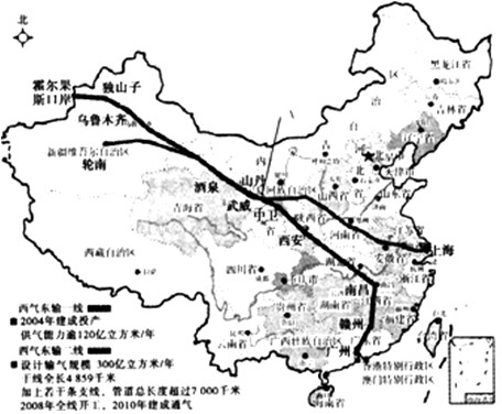 材料一:2008年初,世界最长的跨国天然气管道西气东输二线工程正式开工。该工程外连土库曼斯坦的中亚天然气管道,西起我国霍尔果斯,南至广州、深圳和香港,是世界上最长的跨国天然气管道,将国内外天然气输送到珠江三角洲、长江三角洲,为我国东部地区提供清洁能源,意义重大,影响深远。