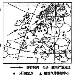 读欧洲酸雨的pH分布及风向图,回答下列问题。(15分)