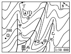 【小题2】④地与丙村之间有山脊阻挡,故其地不能看到丙村。
