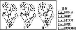 小题2:该流域的三个阶段中,植被逐渐减少,植被涵养水源的能力逐渐下降,在经历相同的暴雨过程中,洪水汇集的时间逐渐缩短,故阶段Ⅰ对应曲线③,阶段Ⅱ对应曲线②,阶段Ⅲ对应曲线①。