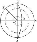 2、综合题 读南极为中心的投影图,下图中最外圈为赤道,虚线表示回归线与极圈,AB代表晨线,OM、ON为日期分界线,∠MOC=450,回答下列问题。(9分)
