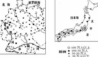 2、综合题 读德国和日本城市分布图,完成下列要求。
