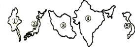 本题解析:试题分析:根据图示的国家轮廓判断,①为缅甸,位于东南亚;②为日本,位于东亚;③为伊朗,位于西亚;④为印度,位于南亚;⑤为越南,位于东南亚。