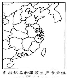 1.纺织和服装是我国的优势产业,影响该产业的主要区位因素是????????。(1分) 2.从图中可以看出,我国的纺织、服装专业镇主要集中在长江三角洲和??????????三角洲。(1分) 3.这些专业镇在产业内部和产业之间的地域联系方式有????????、????????、商贸联系。(2分) 4.近些年来,我国的纺织服装企业有向中西部地区转移的倾向,试分析因???????。(2分)