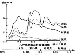 ①地形图层②交通图层③气候图层④人口图层? ⑤商业网点图层?⑥水系图层????⑦管网图层????⑧城市图层 A.①②⑤⑥ B.③④⑤⑦ C.②④⑤⑧ D.⑤⑥⑦ 参考答案:小题1:C?? 本题解析:试题分析:小题1:RS(遥感)能够提供影像信息,所以表示“提供影像信息功能”的是①和⑤; GPS(全球定位系统)能够提供定位信息,所以表示“提供定位信息功能”的是⑥和④; 乙部分为RS和GIS的综合运用,即可可实时掌握水灾淹没区的动态信息,以及分析水灾损失;判断火势蔓延方向要运用能够提供实时影像信息的RS,丙是GPS与GIS的综合运用,所以D项错误。 本题难度:一般 3、单选题 一种物质所产生的自身辐射或对外来辐射所产生的反射和透射,形成了该物质的一种特殊标志——波谱特征。该图显示了松林、草地、红砂岩和泥浆的反射波谱曲线,读图回答问题。 |