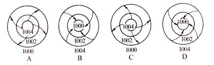 本题解析:试题分析:气旋为低压中心,A、C项错误;北半球的气旋,风向向右偏,故D图正确。