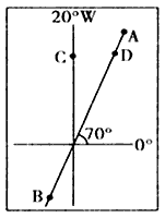3、综合题 下图中AB为晨昏线的一部分,A为晨昏线上纬度最高点,C和D在同一纬线上,A、C、D三点所差经度数相同,此时地球公转速度较快。读图,回答下列问题。