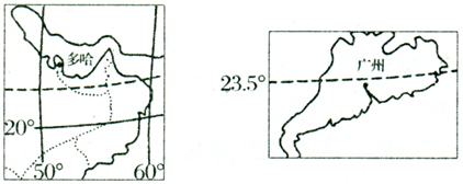 小题2:广州位于亚热带的大陆东岸,受季风环流影响,故形成季风气候,而多哈位于回归线附近大陆的中部,故受副热带高压或信风带的影响,而形成热带沙漠气候。