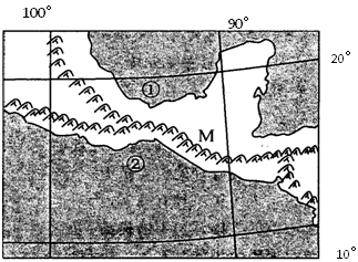本题解析:小题1:根据图中的经纬网和陆地形状判断,该地位于中美地峡,M地东北部位于东北信风的迎风坡,降水多,西南坡位于背风坡,降水少。所以本题选择B选项。