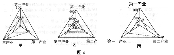 2、单选题 图4中甲、乙、丙表示2007年我国江苏、陕西、西藏三省区的国民生产总值(单位:亿元),其中a、b、C分别代表三大产业的产值。读图回答7—9题。