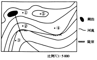 【小题2】在等高线地形图中,不在等高线上两点间的相对高度公式是:(n—1)d≤△H <(n+1)d,其中n表示两地间不同等高线的条数,d表示等高距。带入n=2,d=20,可得④⑤两点之间的相对高差△H ,所以20≤△H <60,故选项B正确。