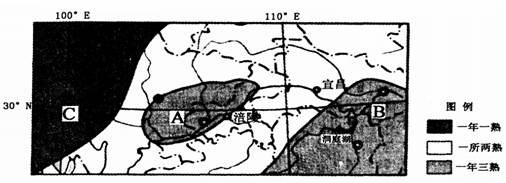 ⑴在仅考虑自然条件的影响下,复种指数和作物熟制存在着怎样的关系?并分析图中A、C两地复种指数不同的原因。(14分)