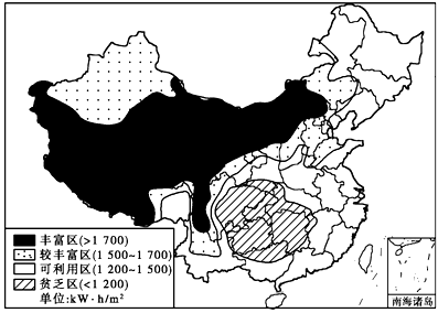 5、单选题  下图是“我国太阳年辐射总量的分布图”,图中太阳辐射丰富区太阳能丰富的原因有(  )