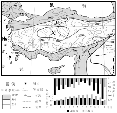A.①地区 B.②地区 C.③地区 D.④地区 参考答案:小题1:A 本题解析:本题考查气候条件分析。利用图示资料1月、7月气温数值以及7月、全年降水量分布判断:①最低月温在0°C以下,且年降水量约500—600mm,夏季降水较集中,判断为温带季风气候;②最低月温为1月,在0°C以上,且年降水量600—800mm左右;降水分布均匀,判断为温带海洋性气候;③最低月温在15°C以上,降水总量丰富,且集中在夏季,判断为热带季风气候;④最低月温为7月,为南半球,最低月温在0°C以上,且年降水量在800mm左右,7月降水较多,故反映雨热不同期,表示南半球的地中海气候。小题1:冬春季节农业生产易受干旱、寒潮影响的是纬度较高,降水较少的气候类型。 本题难度:一般 2、单选题 下图是海洋与陆地气温年较差随纬度变化图。读图回答1-2题。 参考答案:1、A 本题解析: 本题难度:一般 3、综合题 下图中的甲国有“欧洲能源接口”之称,俄罗斯和中东地区的输油(气)管道大多通过该国进入欧洲。甲国农业生产空间分布差异明显,沿海地区以园艺业(柑桔、油橄榄、蔬菜等)为主,而中、东部内陆以放牧业为主。横跨亚、欧两洲的A市是甲国最大的工业中心,人口约1350万。(18分) 参考答案:(1)降水量从沿海向内陆递减;冬季多雨,夏季少雨。(2分)< 本题解析:试题分析: 本题难度:一般 4、单选题 读我国部分地区冬季气温分布图(下图),可知 |