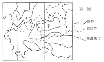 根据等值线的递变规律,按递增或递减的顺序变化。甲区域气温低于4℃,A错。根据经纬度及省区界线,甲区域位于云贵高原北侧,不能受西南季风影响,B错。西风带受青藏高原阻挡,不能影响乙区域,C错。甲区域受昆明准静止锋影响,多处于锋面雨区,D对。