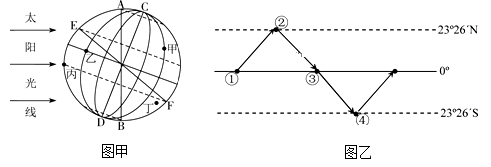 (3)图甲所示日期太阳直射点位于图乙中 位置(填序号)。