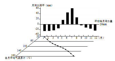 3、单选题 读世界某地区气候资料图(平均每月降水量=年平均降水量÷12,月降水距平=该月多年平均降水量-平均每月降水量,本月平均气温累计=本月平均气温+上月平均气温累计),完成下列各题。