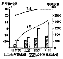 5、单选题 读我国四城市降水量柱状图和1月、7月气温曲线图,回答(1)——(2)题。