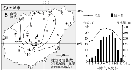 (1)从图中等高线可以看出,乙地位于内陆地区,地势较高,且位于山地迎风坡,橡胶寒害比较严重。