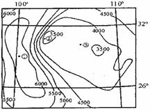 3、单选题 该图为我国某区域年日照时数(指地面接收太阳辐射时间的一年累计值,以小时为单位)分布图。读图回答问题。