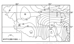 【小题1】按图中等值线数值变化趋势可知甲地数值在50—52之间,乙地数值在64—66之间,乙云量大于甲地,故甲地晴天多,多年平均日照时数长于乙地。A正确。