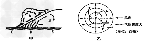 (2)从性质上看,甲图中B是?????? 气团,C、D、E三地中气温最高的是????????地;甲图为?????? 天气示意图,该锋面过境时,若出现降水,主要出现在锋_________(前或后),且降水类型多为__________________(连续性降水或短时强降水)。