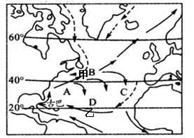 (1)结合洋流分布模式图可知,A为墨西哥湾暖流,是补偿流;B为北大西洋暖流,是在盛行西风吹拂下形成的,为风海流;D为北赤道暖流,是在东北信风的吹拂下形成的,为风海流。