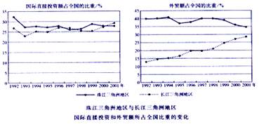 2、单选题 读图“珠江三角洲与长江三角洲地区国际直接投资和外贸额所占全国比重的变化图”,回答问题