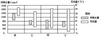 1、与图中甲、乙、丙、丁四种气候类型相一致的城市分别为