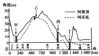 本题解析:试题分析:小题1:京杭大运河沿线的地势高低,黄河以南地区地势北高南低,故判断乙河流为黄河。 小题2:南水北调工程的东线自南向北沟通了长江、淮河、黄河、海河,A错误;由于黄河以南地势北高南低,故该工程需要逐级抽水,耗电量大,B错误;该工程从长江下游取水,调水量较大,但水质较差,C项正确,实施过程中由于有原京杭大运河可利用,故工程量较小,D错误。 点评:本题难度低,基础性试题,学生只要掌握我国南水北调东线工程的基本概况即可判断。
