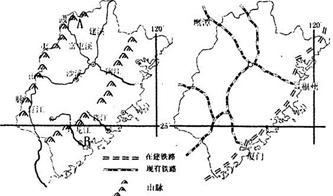 5、综合题 读福建山河分布与铁路交通示意图及材料,回答有关问题。(14分)