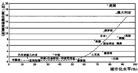 材料二:人均二氧化碳排放量与城市化水平关系图