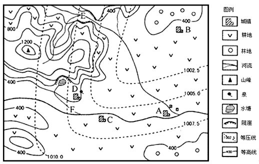 3、综合题 下图是我国东部季风区某地区等高线地形图及某时刻海平面等压线图。当冷空气缓慢进入并滞留于图中某些地区时,气温下降致使水汽过饱和会产生浓雾,并对人类的生产和生活造成影响。读图回答下列问题。(17分)