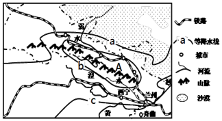 (2)比较图中a、b、c三条等降水量线的大小关系,并分析该b线闭合区域降水出现差异的原因。(3分)