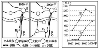 (3)图24的①、②两线中,反映G城人口变化特点的是???????线,这说明20世纪80年代以来,G城市人口变化的特点是???????。(2分)