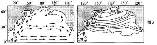 5、单选题 图5中甲为北太平洋洋流分布,乙为北太平洋表层海水的溶解氧量。下列对这个材料的说明正确的是