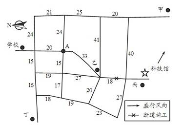 本题解析:小题1:根据线路图和图例中断道信息进行计算。注意看清图中指向标,如果行驶的方向向东,距离为(24+25+20+40=109);如果行驶的方向向南,距离为(33+20+23+27=103);如果行驶的方向向西,距离为(15+17+19+23+27=101);向北行驶路程明显过长,所以选C项。