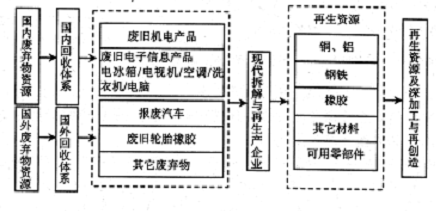 3、单选题 现代拆解与再利用产业,几乎100%对回收废弃物资源进行了利用。下图为江苏扬州静脉产业因产业链基本构架,读图回答下列各题。