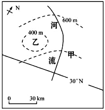 【小题2】根据上述分析可知,图中甲线数值小于600m;乙处数值符合“大于大值或小于小值”的规律,其外围等高线数值为400m,因此,乙处数值小于400m。