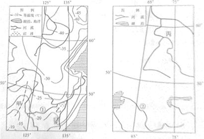 (2)图为某月等温线分布图,简述130°经线以东地区气温分布的显著特点,并运用大气运动的相关知识,解释甲地等温线沿虚线方向弯曲的原因。(10分)