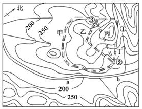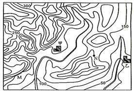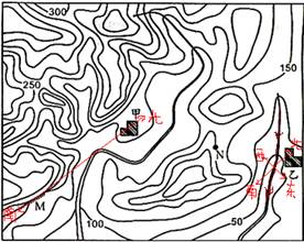本题解析:试题分析:小题1:根据题目中陡崖M在甲村正南方,可以确定地图方向(如图所示);据所学知识可知:河流发源于山谷,由高处流向低处(如图所示)。答案选A。