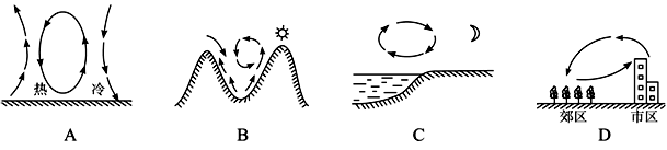 本题解析:试题分析:受热地区空气膨胀上升,冷却地区收缩下沉,从而形成热力环流。所以A图是错误的。山谷之间,白天吹谷风,晚上吹山风,B图是正确的。晚上,海洋降温慢,温度高,气压低,陆地降温快,气压高,所以近地表吹陆风,C图也是正确的。在城市与郊区之间,受城市热岛效应的影响,市区温度高,气压低,近地表风从郊区吹向市区,所以D图也是正确的。故选A。