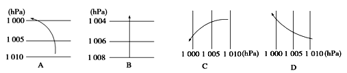 【小题2】近地面风向要考虑摩擦力,风向最终与等压线成一夹角。北半球气流在指向低压过程中,向右偏转。A、B、C错,D对。