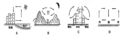 【小题1】根据热力环流原理,受热力的区域气流上升,形成低压。遇冷的区域气流下沉,形成高压。在水平方向上,空气由高压区吹向低压区,D错。白天陆地升温快,是上升气流,A错。夜晚,山坡降温快,是下沉气流,山谷中气温较高,气流上升,B对。市区气温高,气流上升,C错。