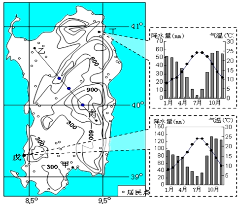 本题解析:试题分析: (1)图示地势最高处的海拔1200—1500米之间,根据地势每升高100米,气温下降0.6°C,故计算甲城与山顶的温差最大可达9°C,即最高处气温不低于22°C。 (2)该岛屿西部以平原、丘陵为主,东部以山地为主;地势东高西低;海岸线曲折。 (3)根据气温和降水资料图判断该岛屿的降水的时间分布规律:夏季降水少,冬季降水多;根据岛屿上的等降水量线的分布判断降水的空间分布规律:东北(或)部降水少,西南(或)西部降水多。联系该岛屿在不同季节所受的大气环流及地形状况分析降水分布的原因。该岛屿地处地中海气候区,夏季受副热带高压控制,以下沉气流为主,气候炎热干燥;岛屿东、西两侧降水都比较少;冬季受西风带影响,气候温和多雨;岛屿东部位于盛行西风背风坡,降水少,岛屿西部位于盛行西风迎风坡,降水多。 考点:地形特征、气候