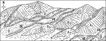 【小题3】在PQ这条考察线路上,这名同学发现了一些有趣的现象:两侧的三角形陡崖一字排开;A1与A2、B1与B2山脉并不相连,但岩石类型和组合形态相同;多条河流不约而同地拐了个弯。合理的解释是