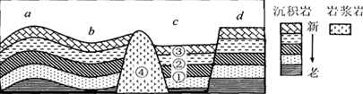 小题3:根据图示岩石的位置关系,④岩层属于岩浆侵入形成,形成时间较晚,岩层年龄最轻。所以本题选择D选项。