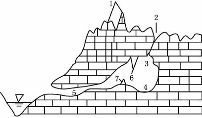 小题2:由岩层状态可知,该处并没有断层发生,故A、D两项错。1为峰林、4为溶洞,由流水侵蚀形成;6为钟乳石、7为石柱,为流水沉积作用形成。